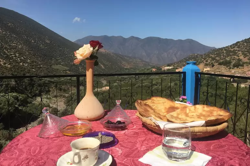 A environs 5 Km avant le fameux village de Ouirgane, nous allons prendre la direction vers une magnifique maison berbère idéalement situé en plein cœur d’un Doaur pittoresque qui s'appelle ‘Doaur Tassa’ a une altitude qui permet de profiter d'une vue magnifique sur la petite vallée de Tassa Ouirgane. Nous allons assister à une démonstration de Tanourt (Préparation du pain berbère) avant de prendre le déjeuner sur les terrasses panoramiques d'une maison d'hôte traditionnelle tout en profitant de cette vue magique sur la vallée et les montagnes de l'Atlas.